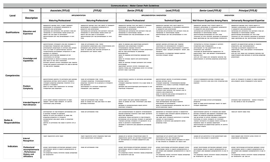 For each role in the lattice, I created a career path framework outlining core qualifications, role competencies, duties and responsibilities, and indicators. These details allowed each person to clearly understand what was required of them to progress in their careers. It also helped managers ensure their team members were building relevant skills and experiences.